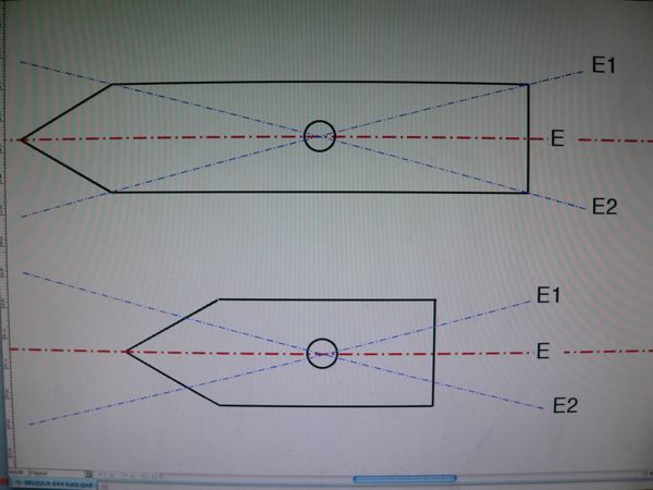Te hago ver un detalle por si no lo pillas: el círculo es el supuesto centro de gravedad y las líneas E1 y E2 representan (exageradamente y en dos dimensiones para que se entienda) dos ejes (máximo y mínimo) entre los cuales puede hipotéticamente bascular la bala en una desestabilización y fíjate que a pesar de que tienen el mismo ángulo en los dos casos y las los balas son del mismo calibre, su efecto tiene que ser distinto por fuerza. A que ahora sí lo ves?