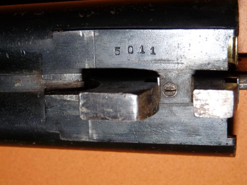 Ninguno de los 2 cañones son los originales de la escopeta, el que lleva marcas de prueba, estas corresponden a las del banco de Eibar y fué probado en 1968, muy posteriormente a la desaparición de la fábrica Jabalí a principios de los años 30. El numero de fabricación -5011- nos indica que la escopeta debió ser fabricada en el año 1900 y por su llave de apertura se corresponde con el modelo tipo Westley Richards que fabricaba Schilling. De ser todo original hubiera sido un modelo interesante, pero en su estado actual su valor es mas bien escaso.