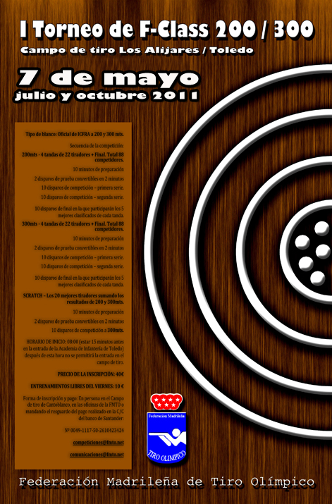 Ya está abierta la inscripción para el Trofeo de F-Class 200/300 del día del sábado 7 de mayo... Promovido por la Federación Madrileña de Tiro Olímpico. También se abre para el Trofeo de ISSF300 de Fusiles Militares Históricos y Match, que se celebrará en este mismo campo el domingo 8 de mayo.