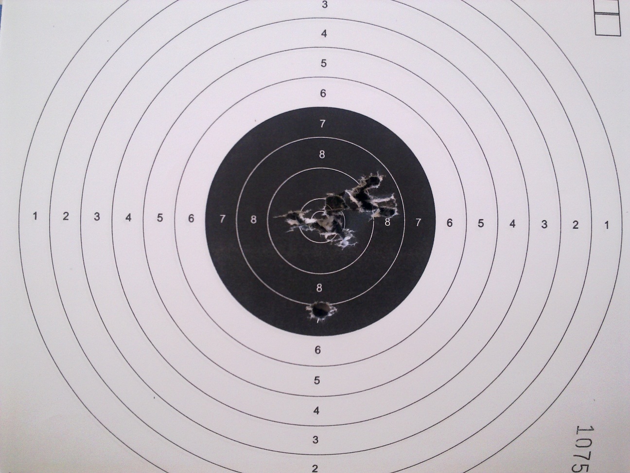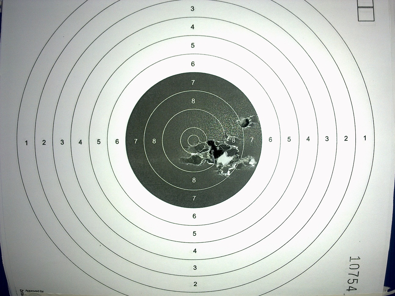 El primero: Hay una buena agrupación 10/9, bien centrada y dos tiros a la derecha muy marcados, uno de ellos malísimo (a cualquiera le pasa).