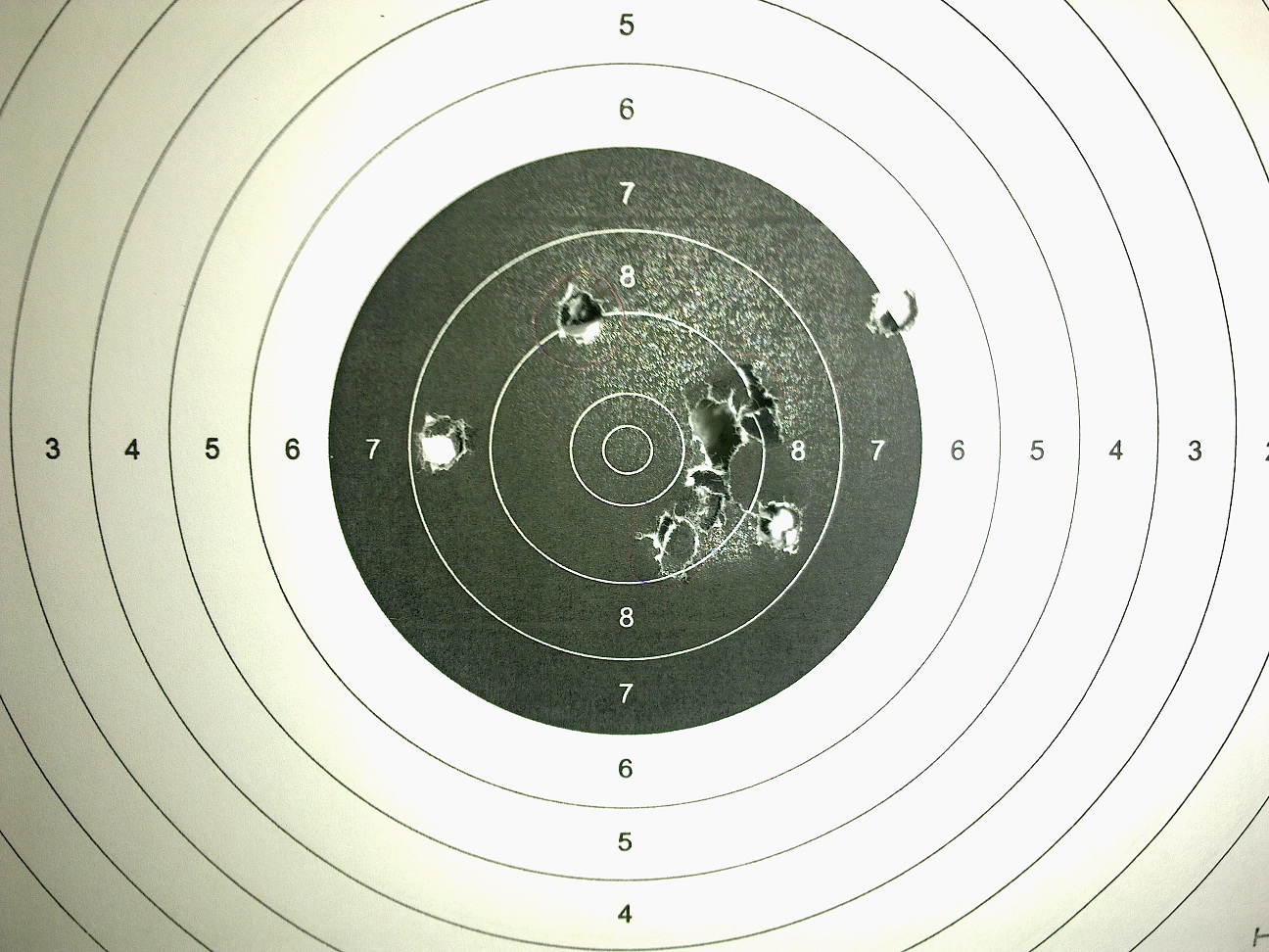 El quinto: Muy buena agrupación algo a la derecha bajo, y el error (menor, pero el tiro esta ahí) a las 2 , las mismas consideraciones, alineación del tirador, revisar el dedo.