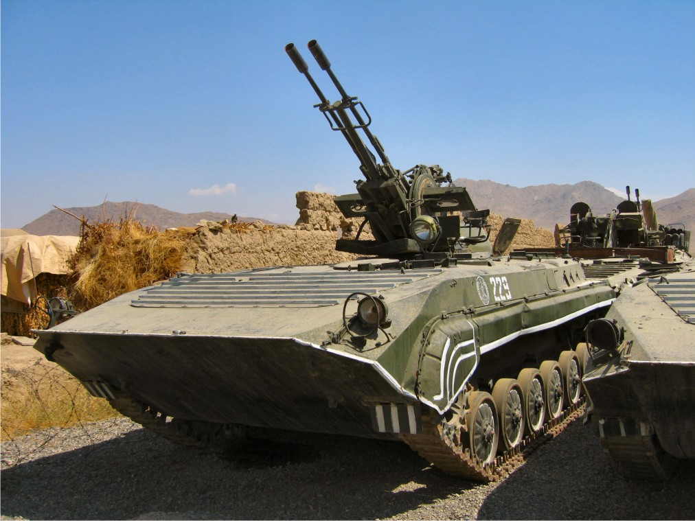 Pues bien, todas estas piezas están desprotegidas frente a agentes NBQ, puesto que son simples montajes sobre chasis, y a lo sumo una especie de casamata abierta por arriba como pasa con el ATP que monta el obús D-30 y para que decir nada del montaje doble similar (ver foto), similar a los que se montaron en Afganistán (ver foto) basado en el afuste doble ZU-23-2. Los cañones antiaéreos montados sobre vehículos, de poco sirven frente a la aviación actual que vuela a alta cota y elimina sus blancos sin ponerse en peligro.