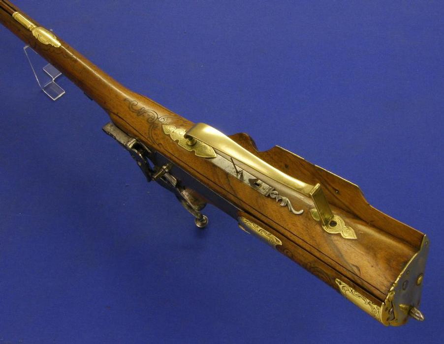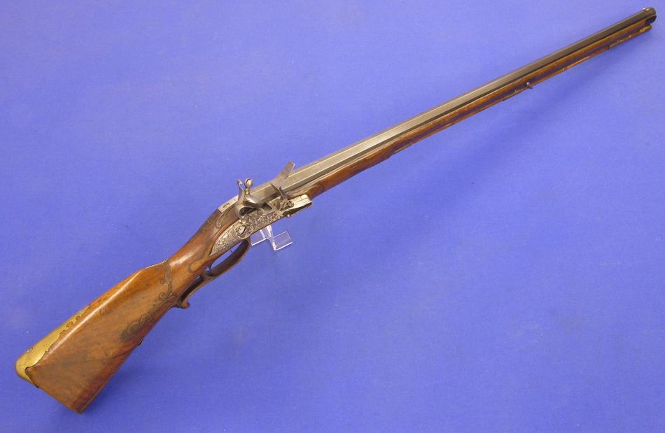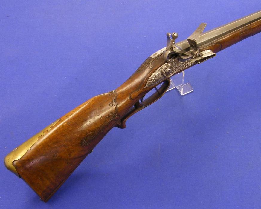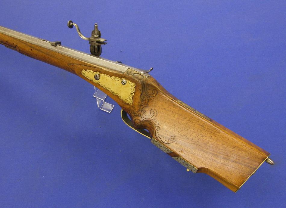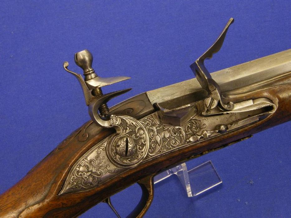 A very nice Austrian Wheellock Rifle by FLUNCK IN ST. POLTEN, circa 1730, caliber 14 mm rifled, length 105 cm, in mint condition. Price on request