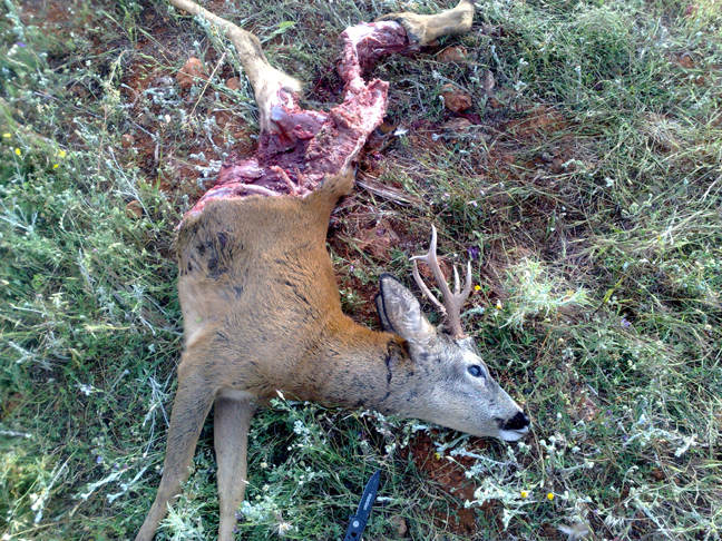 Bromas aparte, lo que ocurrió fue que tiramos al corzo de la foto a 360mts, con muy poca luz, cuando llegamos al lugar del tiro ya denoche encontramos algo de sangre pero del animal ni rastro, no teníamos el perro para rastrear así que dándonos por vencidos a eso de las 24:30 decidimos volver al amanecer.