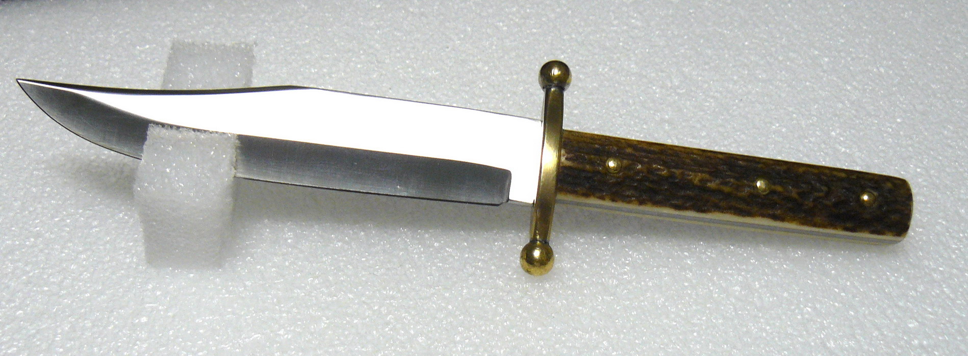 He comprado esta hoja Linder de acero 440 y 15 cm de larga y le he puesto las cachas y guarda que veis, que he realizado a partir de los correspondientes materiales: un pedazo de asta de venado y latón. Las bolas de la guarda, que son un diseño clásico en los Bowie de fabricación inglesa de Rodgers, las he mecanizado aparte y van roscadas y soldadas, porque hacer todo de una pieza me resultaba mas complicado.