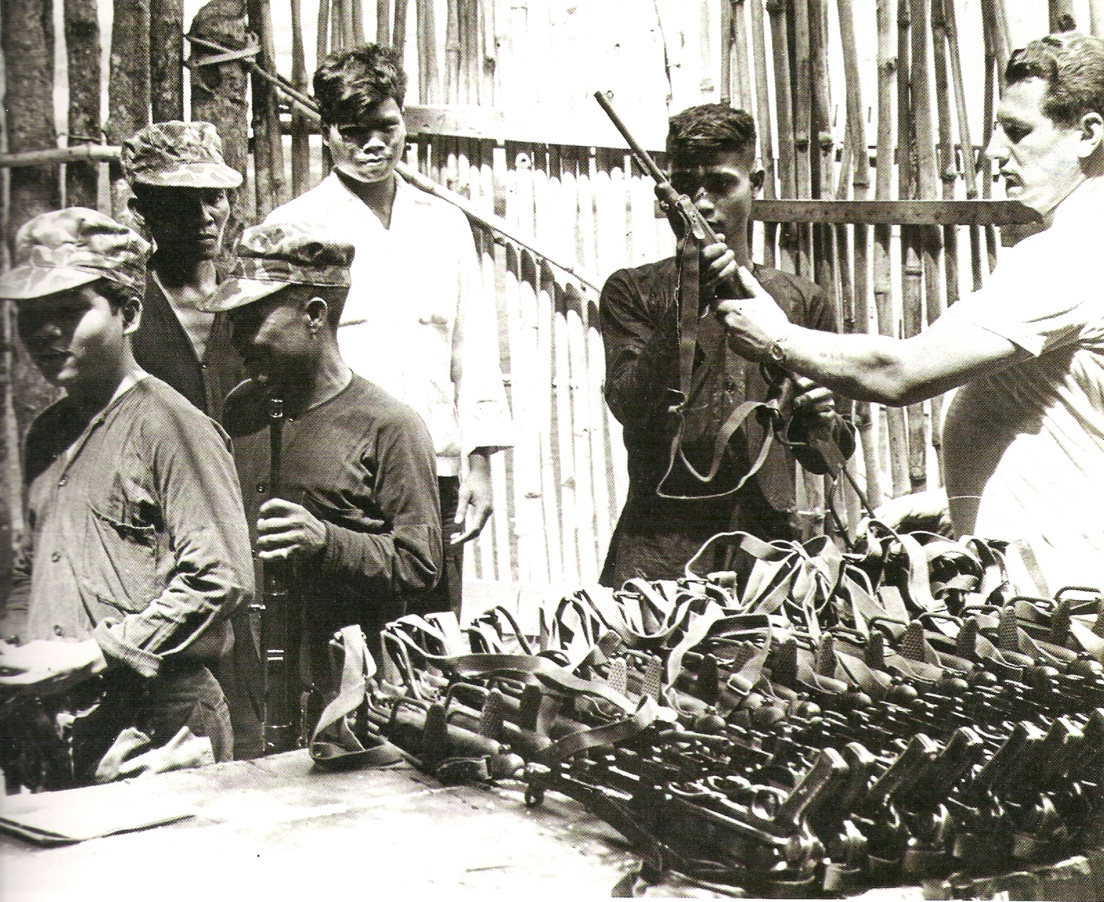 Beltran escribió:Un aporte sustancial al guirigay de armas, lo ocasionaron los propios yankis y sus famosas operaciones encubiertas...para despistar sus actuaciones, recurrieron a proveerse de armas raras, por ejemplo el subfusil Madsen que sale en alguna foto anterior y proveyeron asimismo a sus irregulares de diferentes armas, algunas nada indicativas del proveedor, como se ve en esta foto, en la que un civil está repartiendo carabinas M-1 y MP.40 a un grupo de montañeses para que combatan al Vietcong...