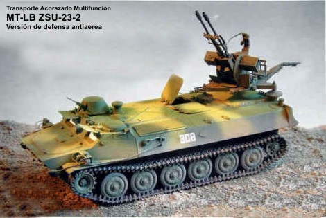 MT-LB ZSU 23-2. De esta variante se han realizado ligeras modificaciones pero siempre similares en varios paises "clientes" y viejos socios de Moscu.