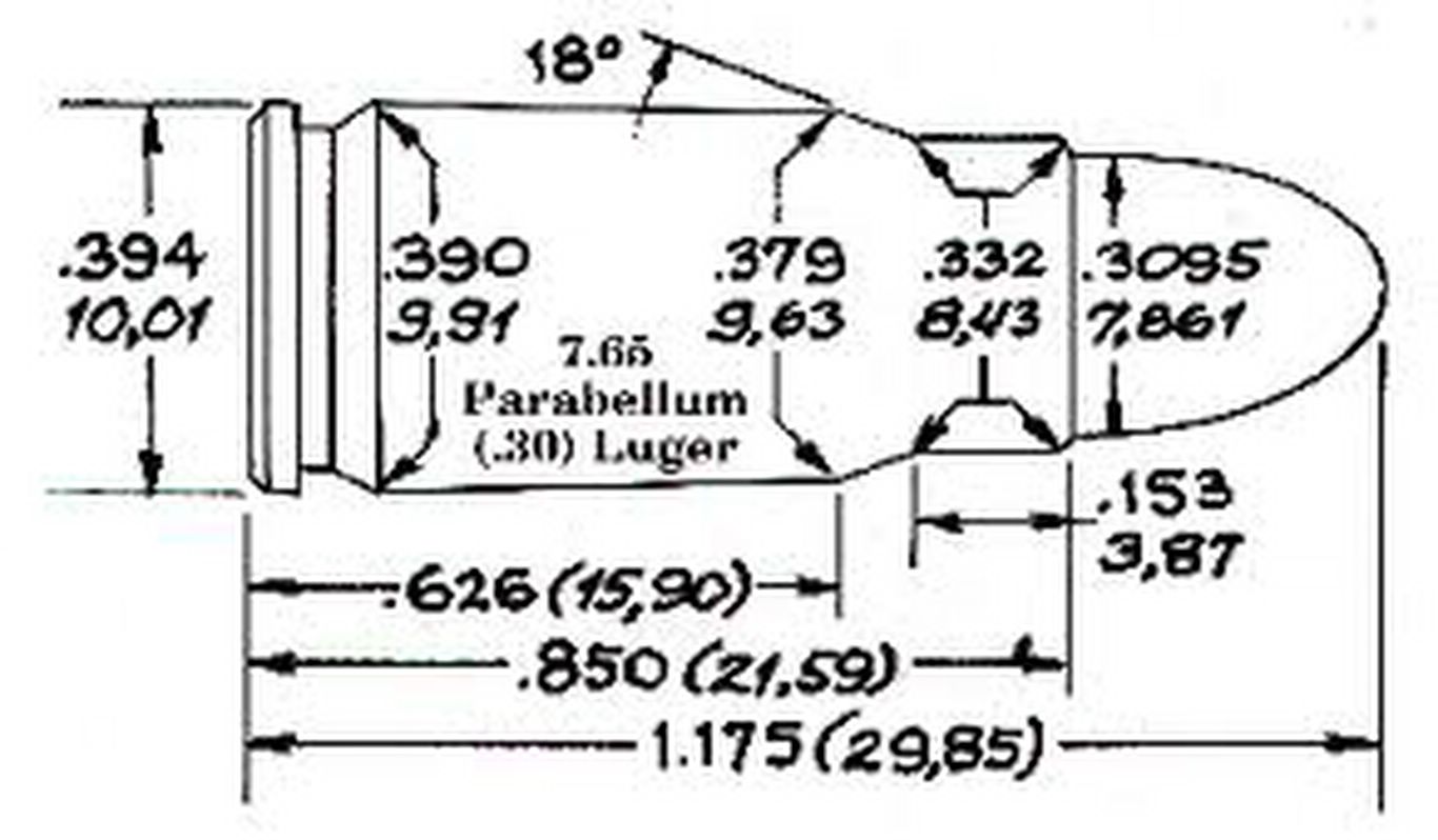 Aunque no he tenido la ocasión de comprobar la agrupación con este calibre (7,65 Para. o .30 Luger) por no disponer de un aparato de sujeción o bancada que fije como Dios manda el arma, sé de buenas y variadas fuentes que este calibre se utiliza mucho en Alemania, Austria y Suiza cuando de pruebas de precisión se trata, de la misma forma que nosotros utilizamos el .32 WC. La diferencia entre ambos (este último y el .30 Luger) es que en el .32 WC la velocidad del proyectil es enormemente más baja que en el .30 Luger. Yo he cargado, siguiendo las tablas de René Malfatti cartuchos 7,65 Para. con pólvora Sp2 y he medido una velocidad inicial en boca del orden de los 547 metros de media (una barbaridad). Para competición, no obstante, las cargo con Ba9 a razón de 5,2 grains para las puntas normales que creo recordar pesan alrededor de 90 ó 93 grains. De este modo obtengo la máxima precisión pero con una velocidad de salida que, si bien aún no la he medido, la calculo del orden de los 420 metros/seg.