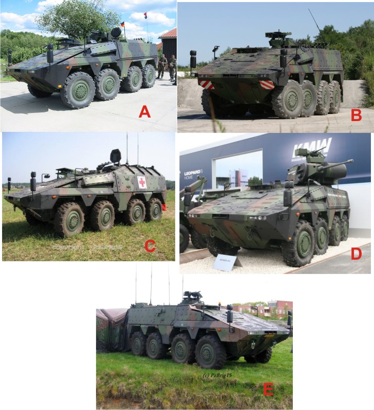 Vehículos de combate – estos estarían asignados al arma de caballería que debería contar en sus 6 Rgto, con la plantilla al completo como vehículos de apoyo a las fuerzas ligeras – de ruedas en versión 6x6 y 8x8, equipados como dije con cañones de 30 mm los ligeros y de 90, 105 y a lo sumo 120 mm., amén de sus vehículos de apoyo (morteros, recovery, ambulancia blindada, etc.) y un buen ejemplar serian los GTV Boxer alemanes, que se disponen en varias variantes tal y como os lo indico en la imagen: