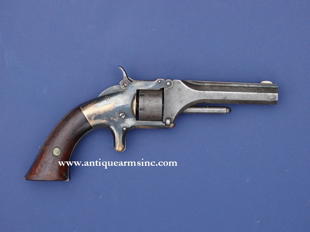 Tiene toda la pinta de ser una copia del S&W modelo nº 1 en calibre 22, digo copia porque S&W marcaba sus armas y las copias no siempre o con imitaciones de las marcas originales.