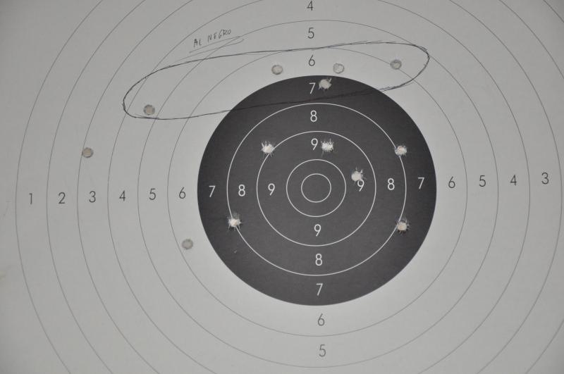 Hola a todos, pues como de costumbre erre que erre. A vueltas con la Tanzusu, hoy prepare unas carguitas para la nena. Solo dos retardos y un fallo, vamos que no salió el tiro. Los primeros 5 disparos son los que están en lo más alto pintados con bolígrafo, tras comprobar que todos se marchan altos decido apuntar a pie de blanco. Los resultados mejoran, tengo que decir en mi favor que el alza sigue sin tocar por lo que no tengo casi referencia pala alinear las miras. La verdad es que cuesta empuñarla la condenada y de pararla ya ni hablemos, para que no se deslice entre los dedos la cojo muy atrás y eso dificulta mas el pararla. La verdad es que no se como cogerla mas por arriba para que se pueda parar mejor, al dispararla se desliza entre los dedos.