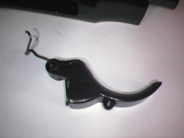 Empujamos la biela de disparo y el disparador todo lo que podamos hacia adelante, comprimiendo el muelle del seguro de aguja, giramos el disparador hacia la izquierda y sacamos la biela del alojamiento en el armazón, hasta que el disparador se desenganche del eje de la biela y el muelle del disparador se suelte de la ranura de la biela.