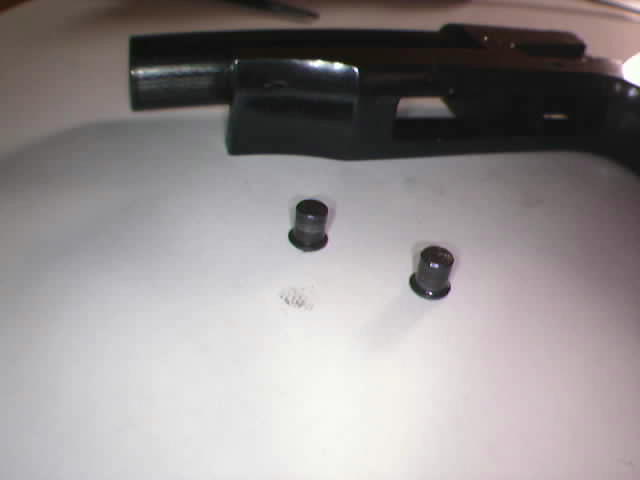 Sacamos el pasador de la tapa del muelle real del martillo presionando la tapa al mismo tiempo que empujamos con un botador el pasador.