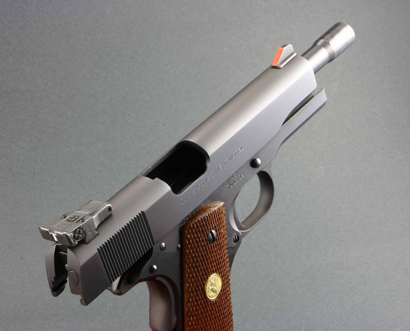 -. La configuración externa de estas pistolas era en esa época bien acabado “dulite” (pavon azul) o bien “nickel” o “satin nickel”. Desde el año 1948, tras reorganizar la compañía al final de la Segunda Guerra Mundial, se decide que solo las caras planas del armazon y corredera vayan pulidas, siendo el resto de las partes chorreadas. Esto se hizo para ahorrar costes ya que antes solo el lomo superior de la corredera no iba pulido (para evitar reflejos). Esto aplica tanto al acabado pavón dulite como al acabado niquelado PERO no aplica al acabado niquelado satinado (en este caso no hay partes pulidas en ninguna de las caras planas de corredera y armazón). Este último acabado también se conoce como ColtGuard y se confunde por los profanos por acero inoxidable. Ambos acabados niquelados, satinado y brillo, eran aplicados para Colt por la Nytex Corporation de Dallas, Texas