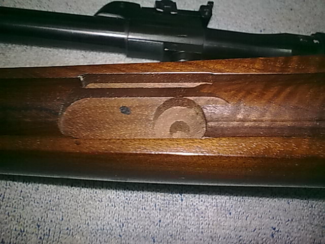 Debajo del alza tiene el casquillo roscado con rosca M6 como se vé en las fotos, y la madera tiene el cajeado para el tornillo pasante, pero "ciego", ya que no hay tornillo que pasar. Da la impresión de que "se les ha olvidado" terminar el agujero para instalar el tornillo y sujetar el cañón a la madera por delante...