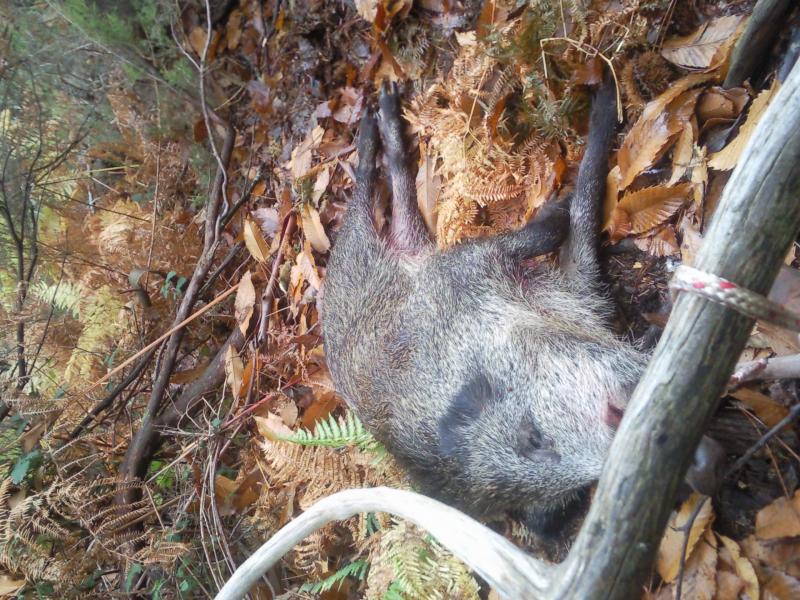 Estaba en el paso del jabalí en un barranco, cuando un compañero que lo vio al fondo desde lo alto de las rocas deicidio acelerarlo tirandole tres tiros, subió monte arriba y al pasar por el barranco nos encontramos los dos sin margen de maniobra salvo despeñarnos, por lo que el bicho mas rápido que yo que siempre llevo el rifle descargado, mientras cargaba el bicho acelero y paso por mi lado pisandome el pie, no me abría sobrepasado cuando ya le puse el rifle cargado, resultado se despeño unos metros y se quedo colgando increíblemente de una raíz por el colmillo.