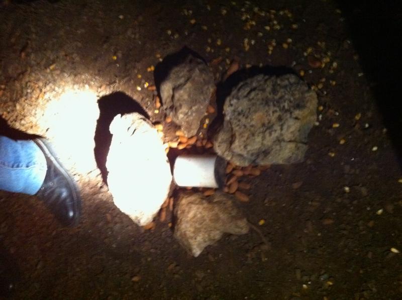 Hola , te pongo unas fotos de un reloj casero y barato. Tienes que comprar un despertador de los baratos de los chinos, y conseguir un bote o una lata con tapa. Al despertador, le colocas la pila solo que roze el borne y compruebas que funcione (debes ponerlo boca abajo). Lo metes dentro del bote con mucho cuidado y tapas. Lo dejas en el suelo junto a algunas almendras, colocas algunas piedras medio tapando el bote y las almendras, y cuando entre el guarro y mueva las piedras para comer, seguro que golpeara el bote, la pila se caera y el despertador se parara.