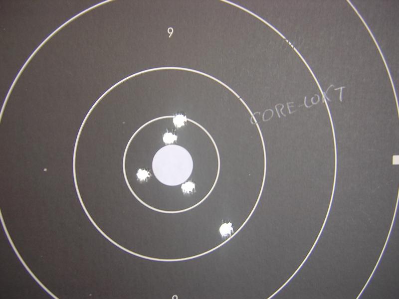Depues de esta decepcion vamos a probar con 5 de remington corelokt a 100m. tambien. Resultado: Uf mejor, aunque uno se me ha ido un poco por mi culpa. Despreciando ese impacto 34mm. pues estaria muy bien. No tengo otros 5 cartuchos de corelokt para repetir.