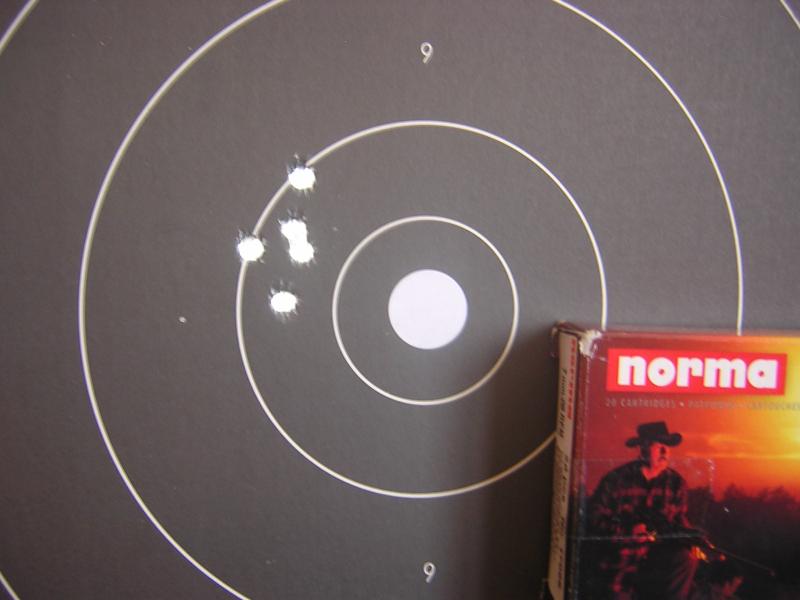 Esta mision es top secret. No hay fotos del lugar. Empezamos a 50 metros, con cartuchos norma, sentados y sobre mesa con la sola ayuda del bipode. 5 disparos las dianas son de pistola 25m. de duelo y con un parche en el centro como referencia. Resultado 16 mm. entre los centros mas distantes.OK.