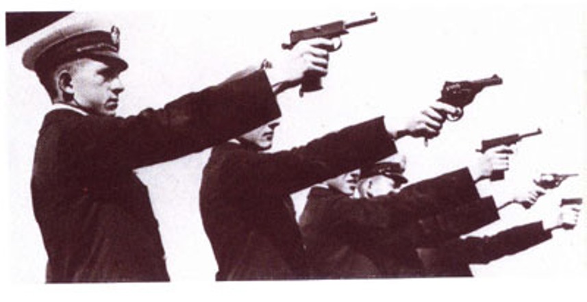 La pistola efectivamente es una Webley & Scott 1912 Mk I reglamentaria en la British Navy entre 1915 y 1950.