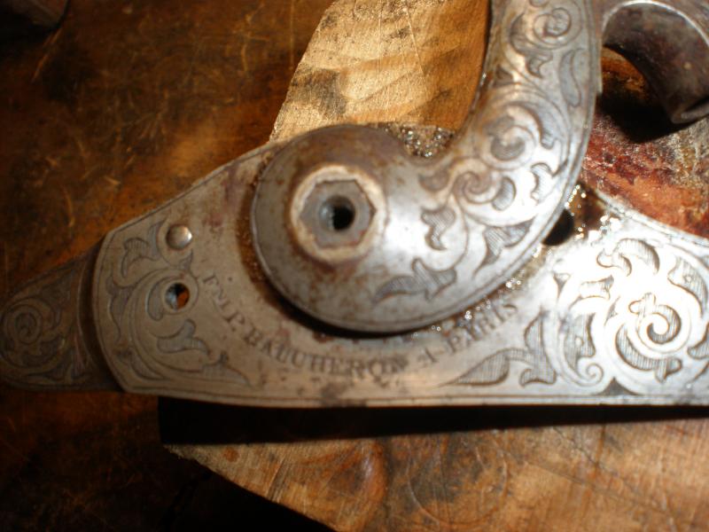 Me he hecho con una pistola de duelo de la casa parisina P.BAUCHERON, os adjunto fotos y enlace de una casa de subastas donde aparece una similar. Agradeceré consejos de como quitarle el oxido, sin dañar en esceso el buen pabonado que tiene.