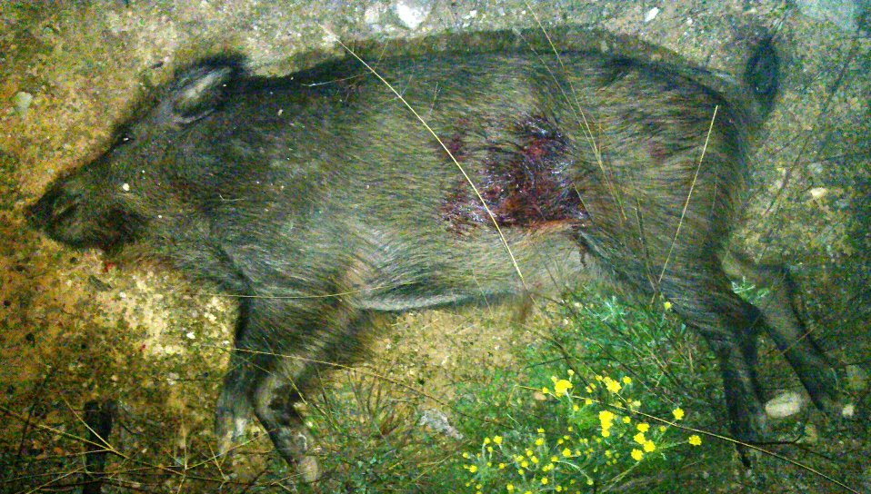Aguardo un poco hasta que esté en mejor posición y se gira lo sufiente. Ya está: En plena cruceta del visor, con mi rifle cómodamente apoyado. Voy amentando la presión sobre el disparador y....¡¡¡¡¡BBBOOOOOUUUUUMMMMMMMM!!!! el estruendo característico del .375 H&H Mágnum destroza el silencio de la noche y casi mi oído izquierdo. El jabalí intenta salir huyendo hacia la izquierda, pero de lo único que es capaz es de hacer un giro sobre él mismo y caer a plomo sobre el mismo lugar donde recibió el impacto.