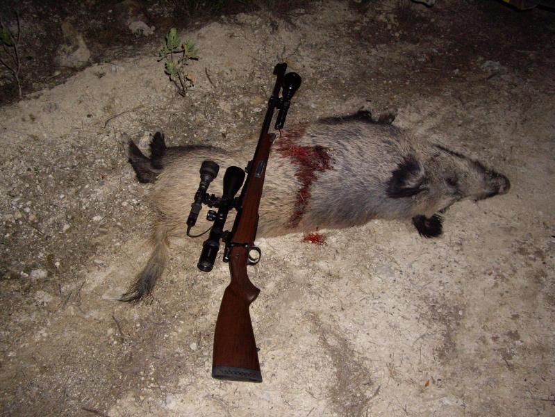 Aguardo un poco hasta que esté en mejor posición y se gira lo sufiente. Ya está: En plena cruceta del visor, con mi rifle cómodamente apoyado. Voy amentando la presión sobre el disparador y....¡¡¡¡¡BBBOOOOOUUUUUMMMMMMMM!!!! el estruendo característico del .375 H&H Mágnum destroza el silencio de la noche y casi mi oído izquierdo. El jabalí intenta salir huyendo hacia la izquierda, pero de lo único que es capaz es de hacer un giro sobre él mismo y caer a plomo sobre el mismo lugar donde recibió el impacto.
