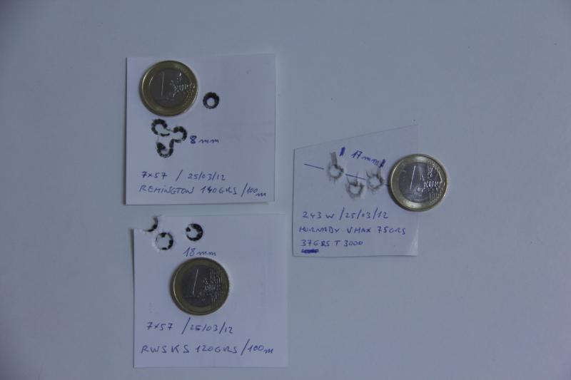 Ahí os dejo una foto de las agrupaciones que salieron el pasado domingo con el SB del 243 (Leupold Vari XII con 12 aumentos) y el SB del 7x57 (Zeiss Diaviari con 6 aumentos).