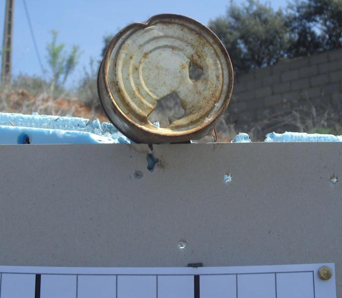 Y este bote que era de los duros fue traspasado limpiamente a 100 m estando lleno de agua. Se pueden apreciar los agujeros de entrada y salida.