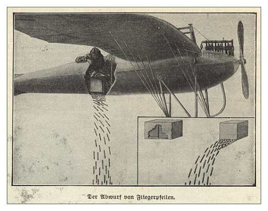 Son las llamadas flechettes, o dardos, en castellano, de acero, de una longitud a partir de 10cms y un peso de unos 60grs las repartían los aviones en los primeros compases de la IGM, sobre las concentraciones de caballería e infantería desde unos 500 metros de altura...eran capaces de atravesar un caballo y el casco y la cabeza de un hombre.