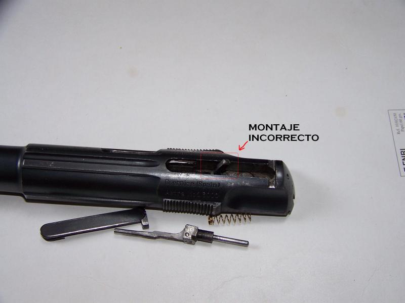 La segunda para ver la parte delantera de las dos en que se divide la aguja percutora preparada para entrar en su alojamiento dentro de la corredera. Observad que el muelle recuperador de esta llega hasta la base.