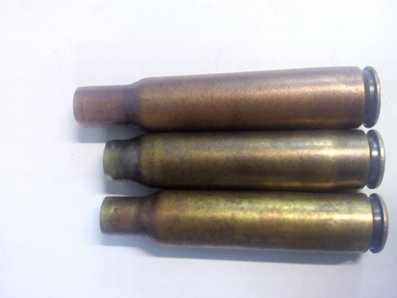 El de abajo es un 6.5x52 de Carcano , el de arriba un 7x57 mauser y el del medio el 6.5 disparado en un 7. Como veis se ha deformado bastante para adaptarse a la recamara.