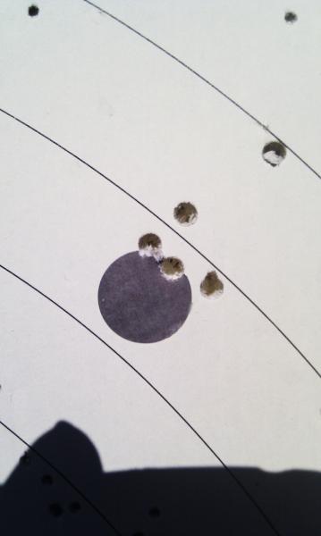 Pues he llevado la carabina a la galeria de tiro para ver como tiraba a esa distancia. He tirado apoyado en una mesa, con un visor sin marca, de 4 aumentos por 32, del año catapun y castigado el pobre. El caso es que con los resultados obtenidos, sin un buen apoyo y con balines no pensados para eso, como sería si tubiera un saco delantero (porque bipode lo veo complicado) y un buen visor. Ahi os dejo la foto, con un fallo clarisimo del indio, pero se ve la agrapación de los otros 4.
