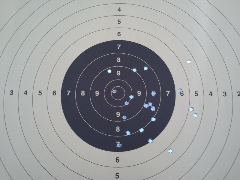 He aqui la prueba, realizada a 50 metros sin mira a pie derecho y sin apoyarme.
