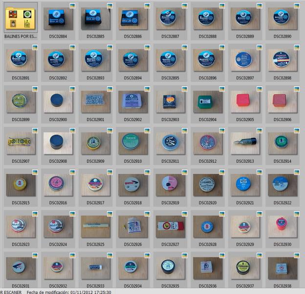 Gracias a todos por la atención que estáis prestando. El pequeño problema es que las fotos ya las tengo hechas y guardadas en el ordenador, y he subido unas cuantas como curiosidad, sin pensar que podía resultaros interesante. Es verdad que subir casi 400 fotos en alta resolución es impensable, por el tiempo y el espacio, pero siempre se puede buscar una solución, como agruparlas por marca, época o tipo de balín. Como muestra, subo un par de capturas de pantalla de la carpeta de las fotos.