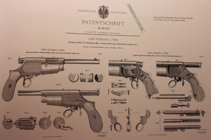 Aqui vemos diseño de patente, con la lámina cargador para cargar el cilindro, y un ejemplo de este modelo de 1897, con capacidad de 6., en calibre 8mm Schulhof 1887.