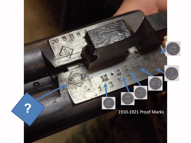 Buenas tardes:Las siguientes fotos corresponden a los punzones de una paralela,calibre 12,fabricada por "Ojanguren y Vidosa" entre los años 1910 y 1921 (al menos eso creo).Lo que no alcanzo a entender es el punzón correspodiente al lobo, tejón, comadreja,oso o lo que sea,que se encuentra dentro de un diamante o rombo.