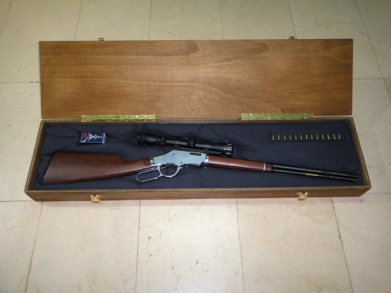 Buenas noches. Estas navidades me he dedicado a hacer un par de cajas de madera para mis armas. La madera es contrachapado de Leroy Merlín, pintada con un lasur de los más baratos, color roble oscuro. Los cierres y las bisagras también los compré de allí. En total creo que fueron 35 €.
