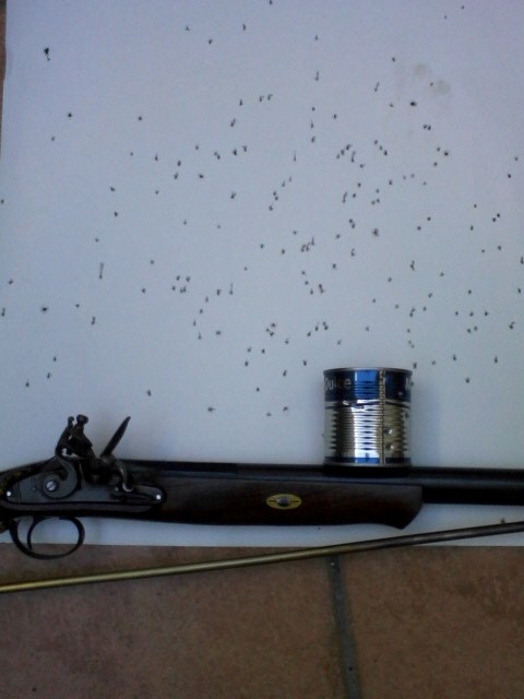 Mirad qué plomeos realiza a 22 metros con 30 gramos de perdigón nº8 y cómo deja la lata hecha un colador. El secreto es que su cañón tiene un diámetro como marca en su superficie, de 18'3mm o lo que es lo mismo, es un cañón cilíndrico mejorado, es decir de lo que serían unas 4**** en escopeta moderna. De ahí la densidad en la agrupación y los tiros largos al plato cuando uno está afinado( si no , ni por esas)
