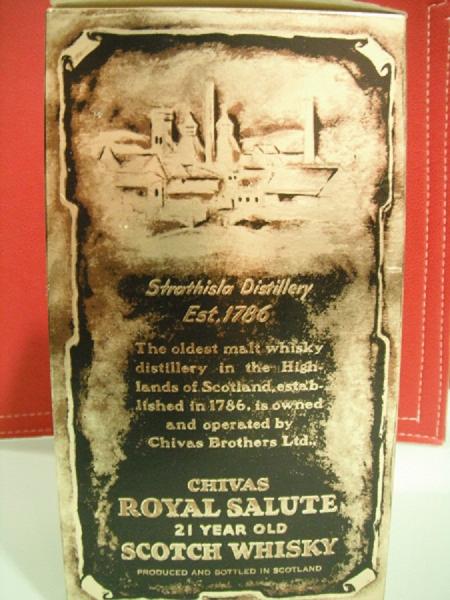 Existe una antigua costumbre de la marina real inglesa de disparar 21 cañonazos al coronarse un nuevo monarca; este hecho le ha dado el nombre a este excepcional whisky: royal salute: “saludo real” y los 21 cañonazos se traducen en el envejecimiento en barricas de robles inglés. Todas son de fina porcelana de Wade tal y como figura en el fondo exterior de la botella. Se distinguen por llevar en el tapón dos estampillas (la roja original de Escocia y la azul del impuesto sobre bebidas de importación en España). Dos unidades disponibles en su funda de terciopelo y letras doradas en excelente estado de conservación.