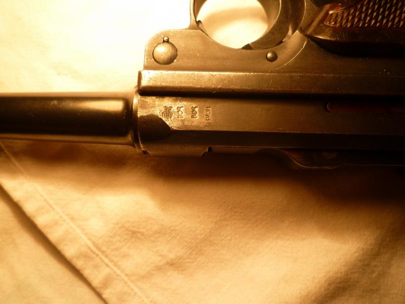 -- La parte de la empuñadura puede ser de una DWM fabricada durante la I Guerra Mundial, al igual que la "horquilla" superior (no me atrevo a llamarla corredera, porque en realidad no se mueve como en las de sistema Colt), y además presenta bajo el guardamonte o junto a el varias marcas interesantes que te hablan de la historia del arma. Puedes ver una especie de X, que significa que en algún momento de su servicio fué capturada por el ejercito ruso, y junto a ella otra marca que la identifica como una de las destinadas a la VolksPolizei en la extinta R.D.A, lo cual corrobora el dato anterior de la captura.