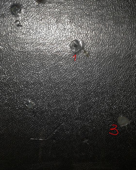 Pasamos al metal, ahí va una de panel sándwich de 30 mm, en la que otra vez el Express y el Magnum demuestran su poderío penetrando en el aislamiento. El Express incluso abolló un poquito la chapa posterior.