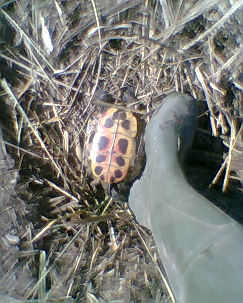 La tortuga entera está al lado de mi bota de agua talla nº44 para que sirva de referencia el tamaño.