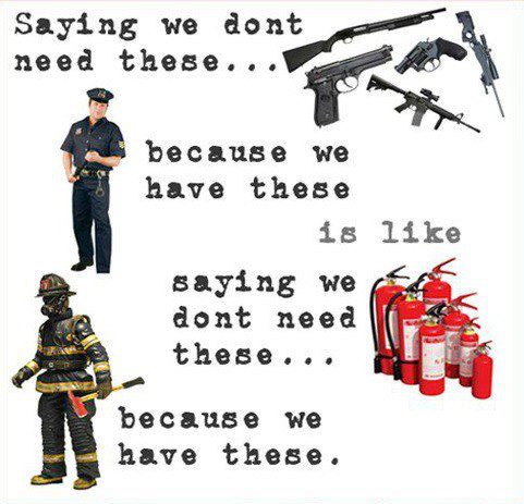 Evidentemente decir que no necesitamos armas por que tenemos policías, es como decir que no necesitamos extintores por que tenemos bomberos.