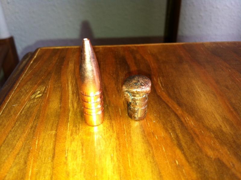 Mando esta foto recuperada de un guarro y clavada en una encina en la que se demuestra que esta bala expansiona, pero de igual forma retiene mucho peso y tiende a ser un poquitin rebotona.