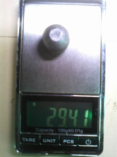 El peso del proyectil es de 29'4o gramos, es la bala Slug de Lee de mi fundida propia, que da 17'45 mm de diámetro, por tanto va subcalibrada y ha de ir dentro de un taco o de un sabot. Yo uso taco de cartucho de caza al que he practicado cortes longitudinales a las aletas para que abandone el proyectil nada más salir del cañón, además dentro lleva una pequeña soleta de cartón para que no se pegue el plomo al plástico del taco. LLeva 1'55 gramos de pólvora Opt-A que es la habitualmente usada para cartuchos de caza en otras medidas,claro está. Cierre en estrella y rebordeado.