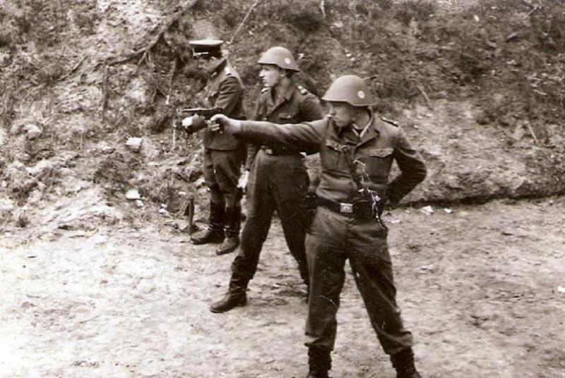 Subfusil MP-40 al hombro, y pistola lanzabengalas LP-42 (Leuchtpistole 42) en la mano.