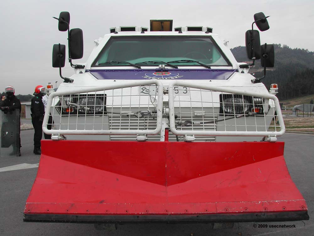 Por eso el despliegue es conjunto. El blindado avanza dando protección con su masa y rejillas laterales o frontales desplgadas, a los equipos operativos que van pegados a él. Las bocachas van haciendo fuego (cadencia de fuego por equipos o binomios) obligando a los radicales a agachar la cabeza. Y desde luego mientras los "infantes" vayan junto al blindado nadie se acercará a él a riesgo de recibir un tremendo pelotazo (que a menos de 50m pueden ser letales).
