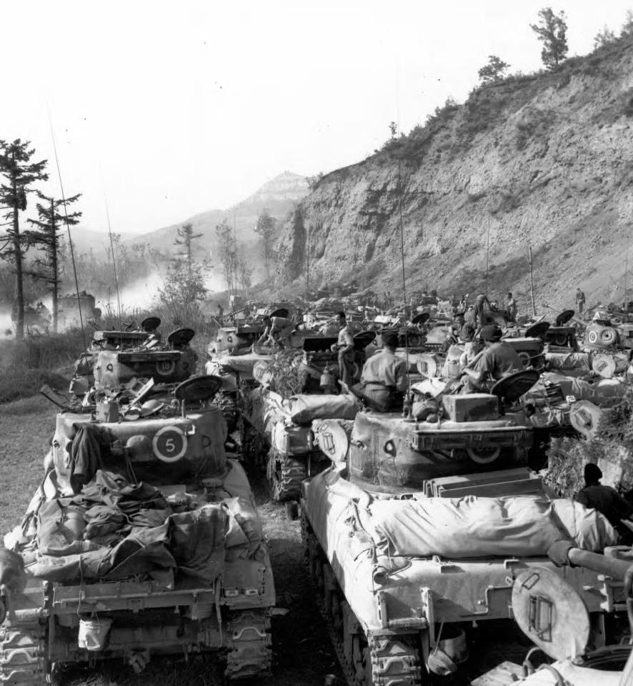 South African Pretoria armoured Regiment wait along Highway 64 for a US infantry division to pass on its way to the Po Valley, 20 April 1945.