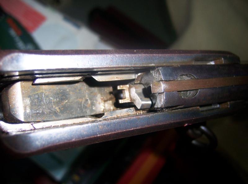 La aguja percutora estaba rota la punta, problema solucionado, sin roscar, soldadura de latón; pero el "problema" es la expulsión, la uña expulsora no sobrepasa la pestaña del cartucho al producirse el cierre, le faltan unas décimas para ello, se nota que se levanta, pero no llega a bajar, con lo cual no se produce la expulsión al accionar la palanca.